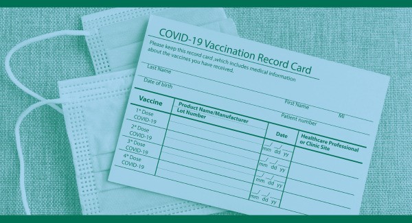 Pictured above: Duotone dark green and white image depicting a U.S. CDC COVID-19 Vaccination Record Card laying on top of two disposable face masks.