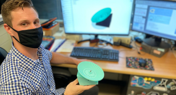 Pictured above: Dr. Bivona sits as his desk in the Poynter lab wearing a black cloth face mask and holding up a prototype of the LOST-Wheel.