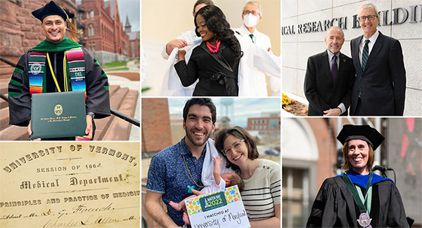 Pictured above (clockwise, from top left): Class of 2022 alum Jose Calderon, M.D.; Shani Legore, Class of 2026 medical student; Class of 1969 alum Steve Firestone, M.D., and Dean Richard L. Page, M.D.; Yvonne Janssen-Heininger, Ph.D., UVM Distinguished Professor of Pathology and Laboratory Medicine; Class of 2022 alum Matthew Hill Brandt, M.D., and family; photo of a College of Medicine medical lecture ticket from the mid- to late-1800s.