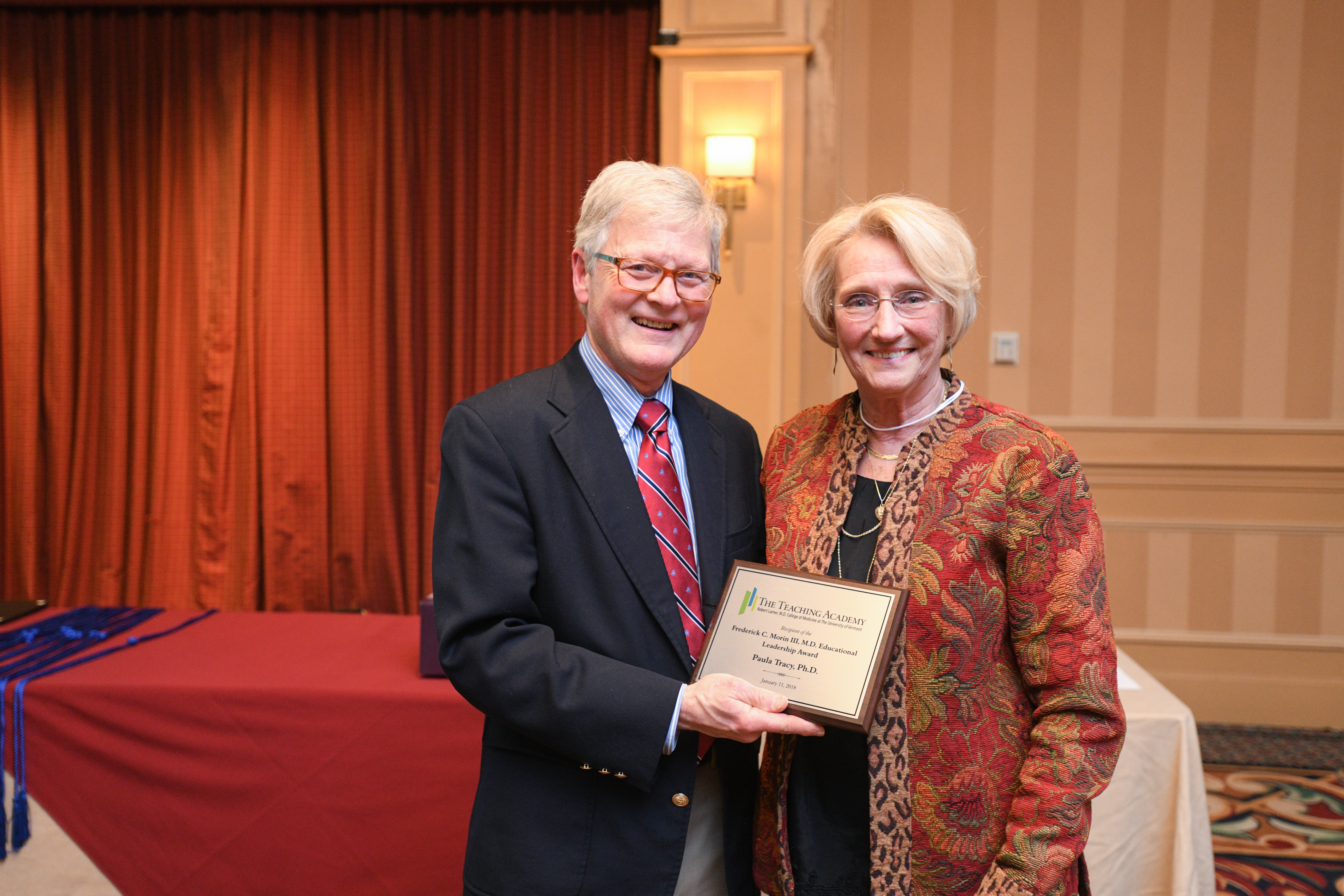 Paula Tracy, Ph.D., outgoing director of the Foundations level of the Vermont Integrated Curriculum (VIC) was honored as the inaugural recipient of the Morin Educational Leadership Award in recognition of her role as “a distinguished teacher, scientist and leader . . . an important role model . . . one of the most effective and popular teachers of medical students . . . one of the original designers of the Vermont Integrated Curriculum . . .”