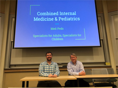 Yesterday, the UVM Larner College of Medicine hosted two visiting physicians from the University of Massachusetts Medical School-Baystate to discuss internal medicine/pediatrics as part of the Careers in Medicine Fall Specialty Series. When asked why students should consider internal medicine/pediatrics panelist Sam Borden, M.D., Assistant Dean of Admissions for University of Massachusetts Medical School responded, “This specialty has all the advantages of family medicine with more opportunities to subspecialize and a greater depth in pediatrics training.” Panelist and Larner College of Medicine alum Josh Price, M.D. ’15 said that he chose to pursue a career in Internal Medicine/Pediatrics after he learned how robust and interesting the training was. Price said he hoped that after the session UVM future docs would be able to “recognize the versatility of a med/peds.